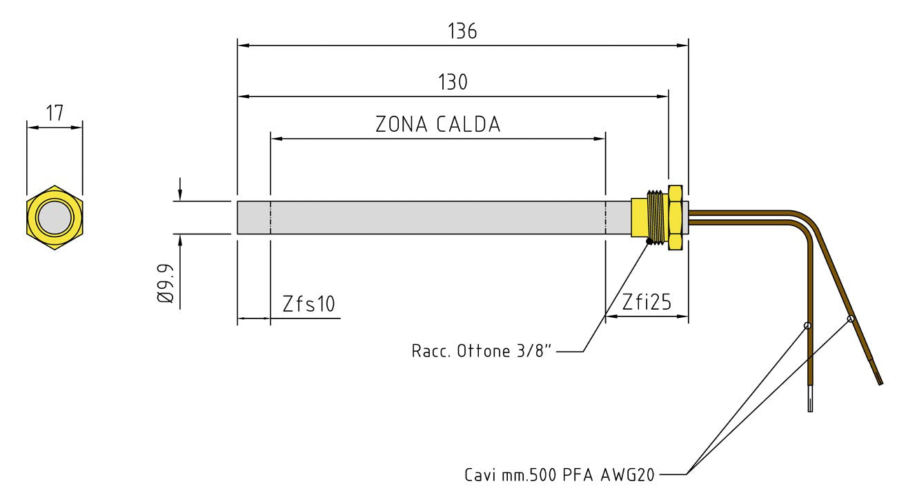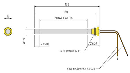 Resistenza accensione stufe a pellet raccordo 3/8 270 W 230 V Ø9,9 x 130/136 mm Made in Italy